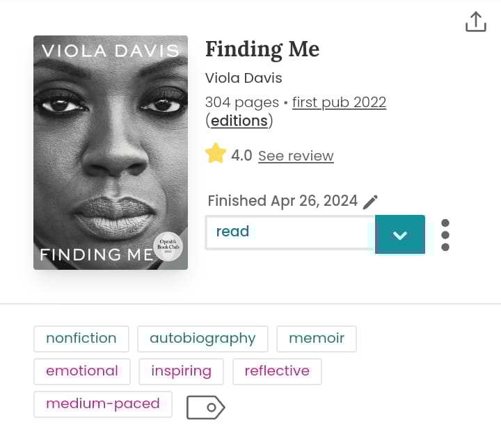 I finished Finding Me by Viola Davis, I read it in between the trips and when I got back sometimes.
