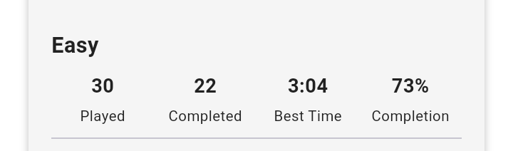 I started playing Sudoku last week, I think. In this app, I'm at the ‘easy’ level and I'm trying to get my completion to 80% and decrease my best time (the number of minutes it takes me to complete one puzzle) to 3:00 before I move to the next level—medium.